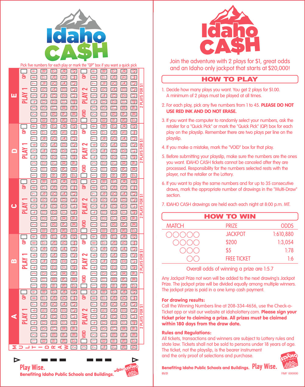 Get two plays for $1. Pick five numbers from 1 to 45. If you’d like the computer to select your numbers, ask for a quick pick. Multi-draw tickets can be produced for up to 35 consecutive draws. Drawings are daily at 8:00 pm MT. This game is only played in Idaho!