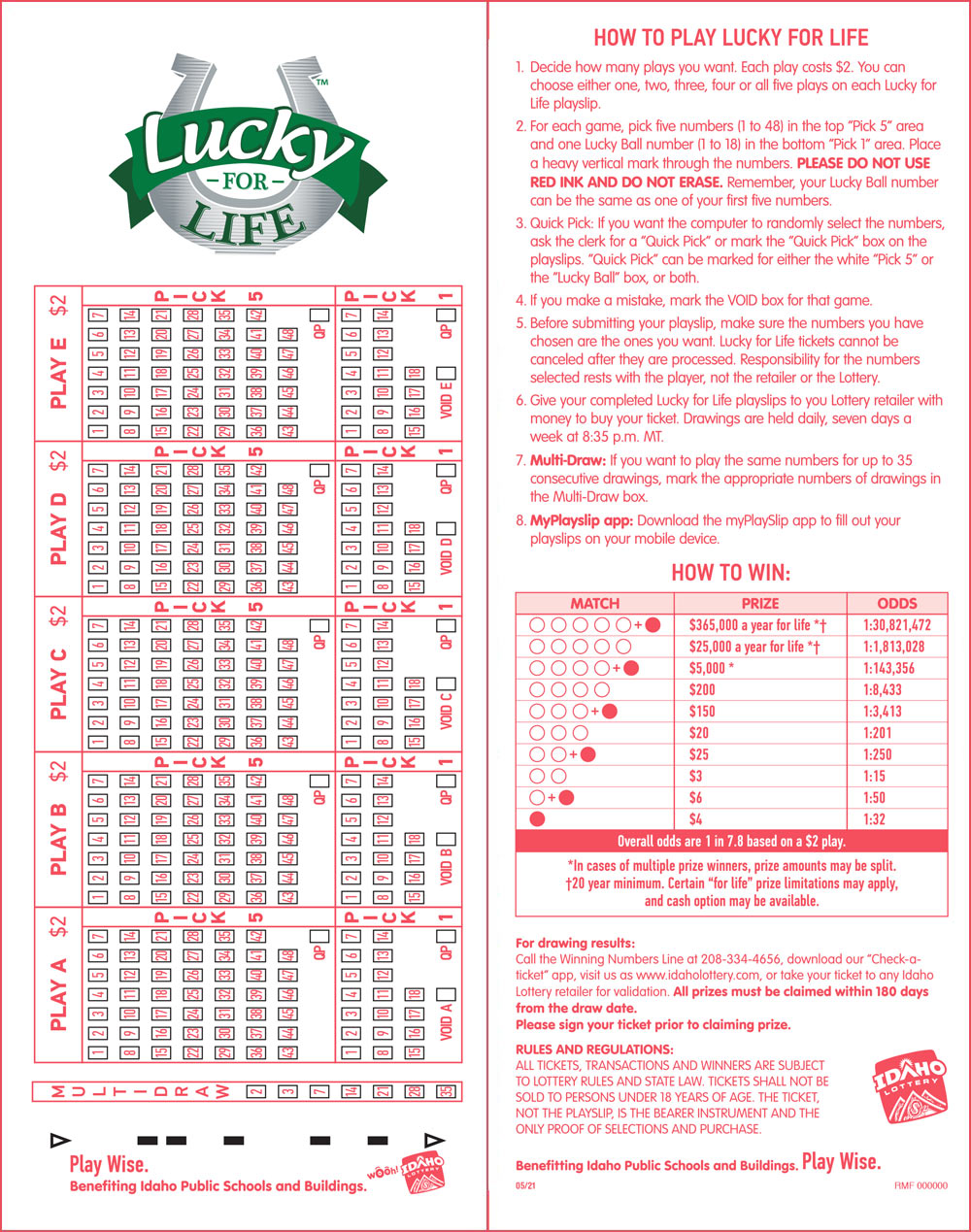Last 10 DrawsMatch Prize Amount Lucky for Life $1,000 a day, FOR LIFE 0 $25,000 a year, FOR LIFE 0 $5,000 2 $200 30 $150 122 $20 1,960 $25 1,654 $3 27,748 $6 8,694 $4 13,148 There were 1,070 Lucky for Life Idaho winners for the last draw.