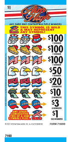 Pull open the tabs to reveal symbols. Get any 3 winning symbols as shown in the prize legend or any other consecutive two-of-a-kind symbol plus a wild symbol and win the prize shown. Win up to $100 on one ticket.All PullTab prizes must be claimed at the location of play on the day of play.