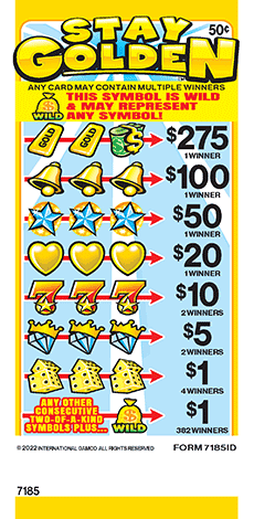 Pull open the tabs to reveal symbols. Get any 3 winning symbols as shown in the prize legend or any other consecutive two-of-a-kind symbol plus a wild symbol and win the prize shown. Win up to $275 on one ticket.All PullTab prizes must be claimed at the location of play on the day of play.