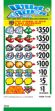 Pull open the tabs to reveal symbols. Get any 3 winning symbols as shown in the prize legend or any other consecutive two-of-a-kind symbol plus a wild symbol and win the prize shown. Win up to $350 on one ticket.All PullTab prizes must be claimed at the location of play on the day of play.