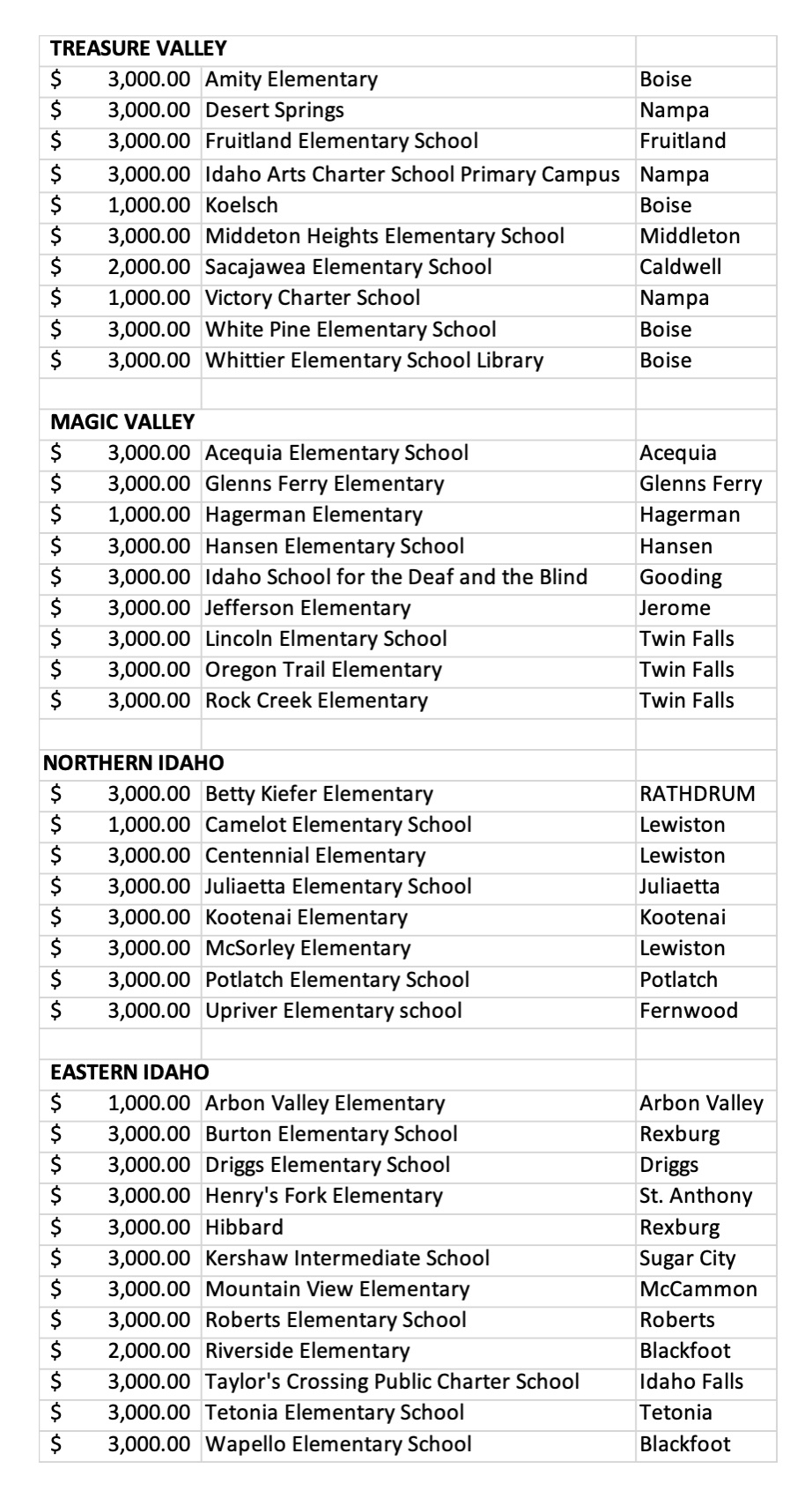 Below is the complete list of awardees in Idaho:
