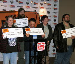 January 3, 2012 - Boise - For six months, a group of co-workers from the Wal-mart store in Ontario, Oregon pooled their resources to save up money to play the Idaho Lottery's annual Idaho $1,000,000 Raffle. The group of five friends who have worked together for at least five years, started saving $10 a paycheck in late June 2011. Once the Idaho $1,000,000 Raffle began, the group's leader Aaron O'Neil began buying a couple of tickets each day the Raffle was offered for sale. The persistence paid off on Tuesday, January 3, 2012 when the group claimed the Raffle's top prize of $1,000,000 at Lottery headquarters in Boise.